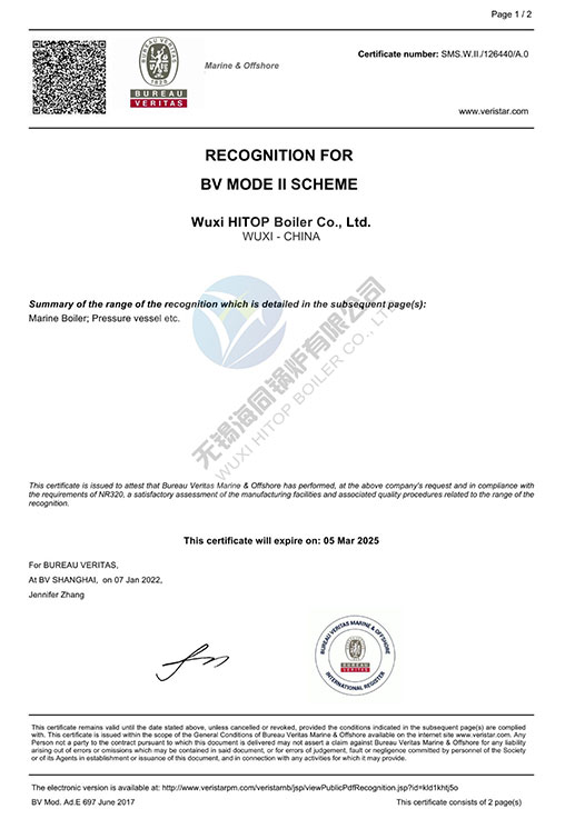 本站讯(特约记者:朱焕昌报道)2022年1月8日,无锡海同锅炉有限公司质量保证中心接到“必维国际检验集团(BV)”函件——公司根据“必维国际检验集团(BV)”要求建立的各项质量保证体系和工厂环境及制造工艺水平等,通过“必维国际检验集团(BV)”专家评审,各项“PDCA”指标符合“必维国际检验集团(BV)”要求。顺利获得“必维国际检验集团(BV)”认可证书。